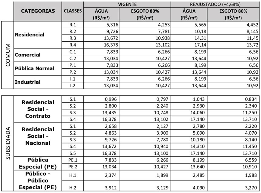 Os usuários classificam-se em categorias divididas em residencial social, residencial, comercial, industrial e pública. Para cada uma delas existe uma tabela com os valores estabelecidos para o consumo de até 10 m³, também chamada de taxa mínima, com aumento conforme a demanda de consumo. Cabe esclarecer que os consumidores residenciais com menor poder aquisitivo também podem solicitar a tarifa social.